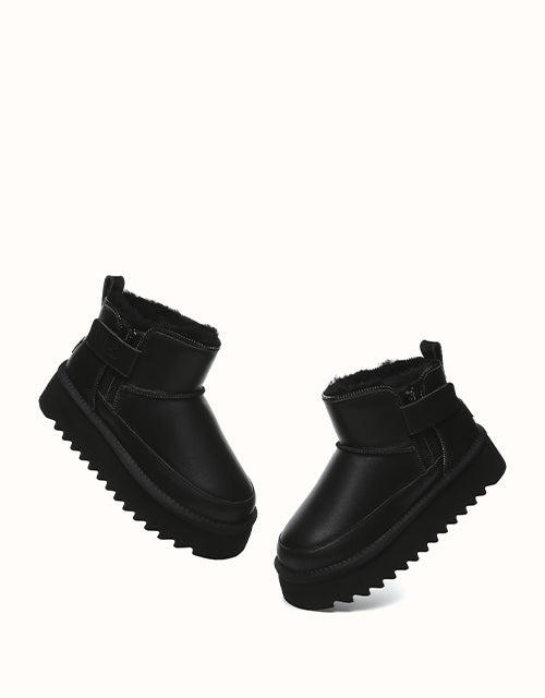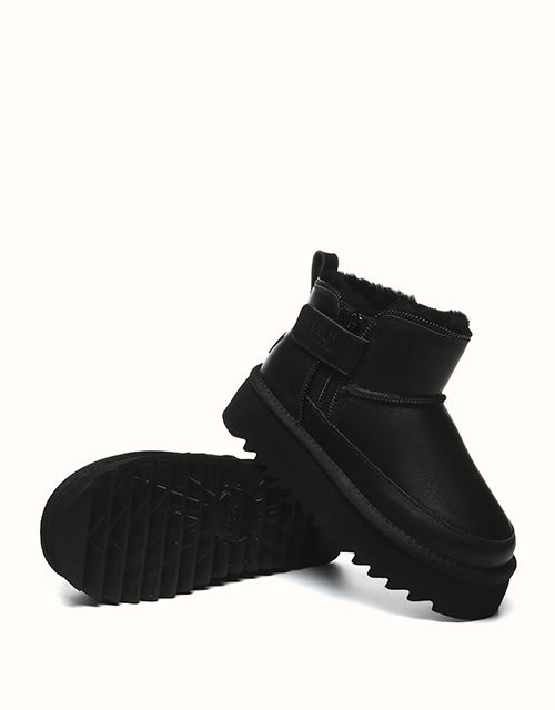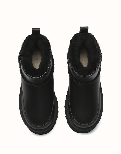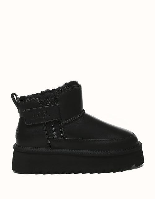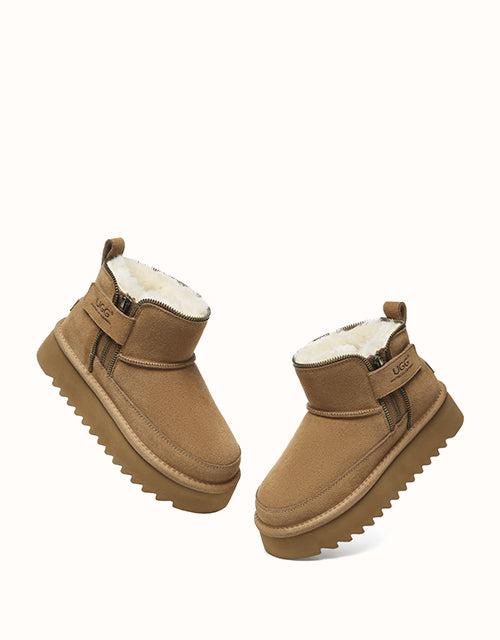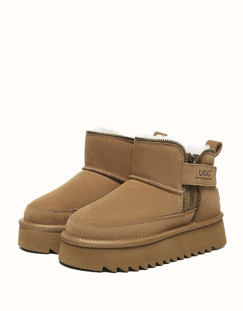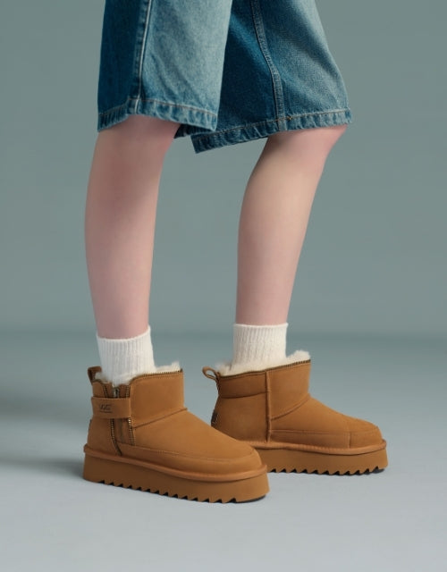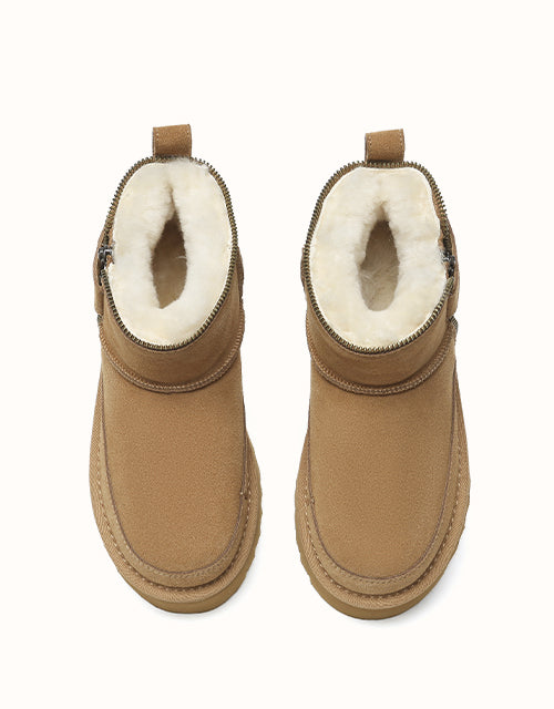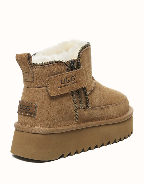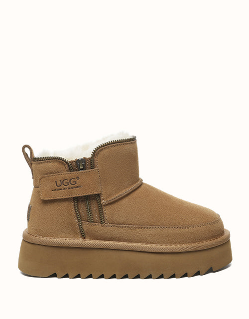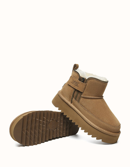 Step into cozy sophistication with the Australian Shepherd Arya Zipper Platform Boots. Crafted from premium sheepskin, these boots feature a convenient side zipper that enhances both ease of wear and style. The sleek design brings a modern twist to classic snow boots, available in Chestnut and Nappa Black to suit your style. Designed for outdoor wear, the trendy platform adds height while ensuring all-day comfort for any occasion.