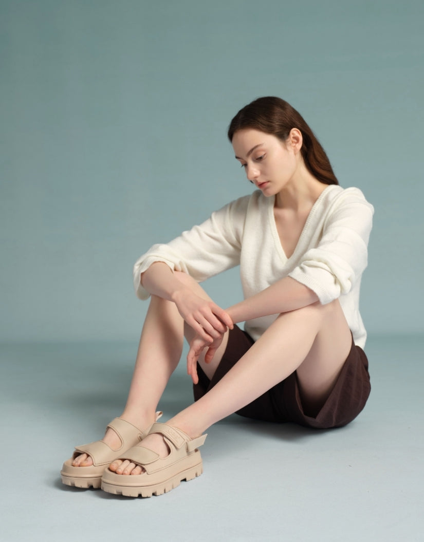 Australian Shepherd Beatia Chunky Platform Sandals combine effortless style and comfort. With double velcro straps and smooth PVC uppers, they’re easy to adjust and wear all day. Available in black, ivory, and beige.