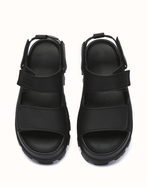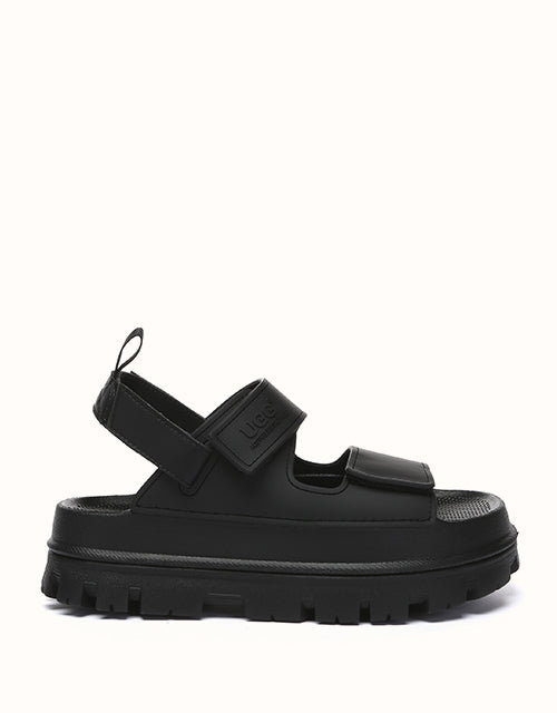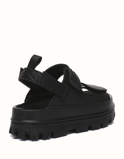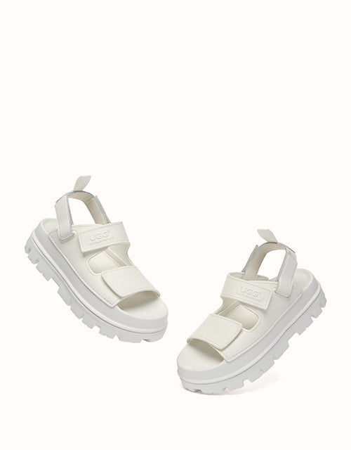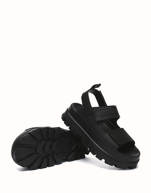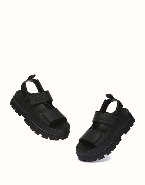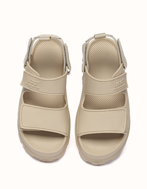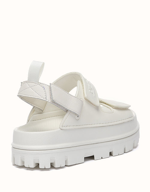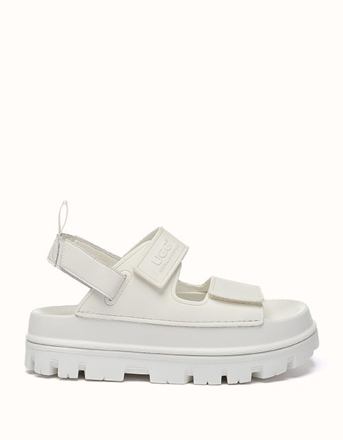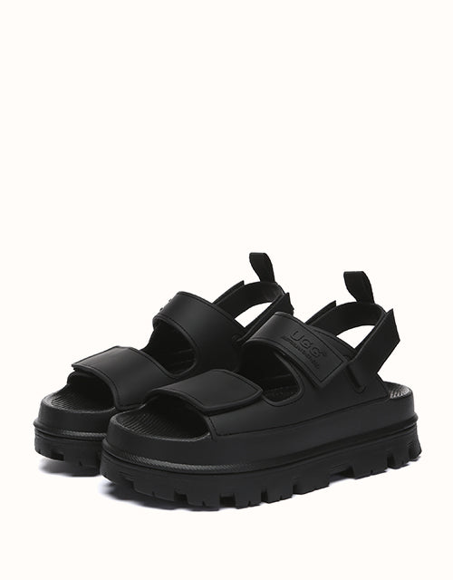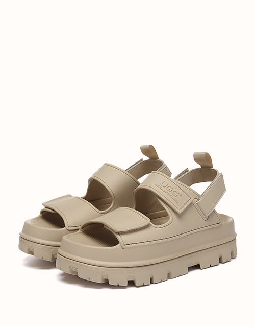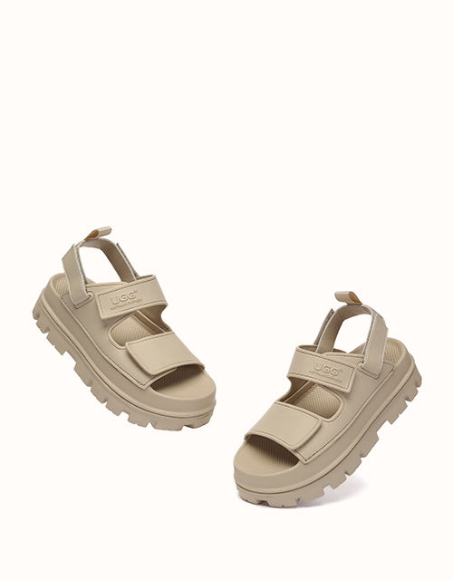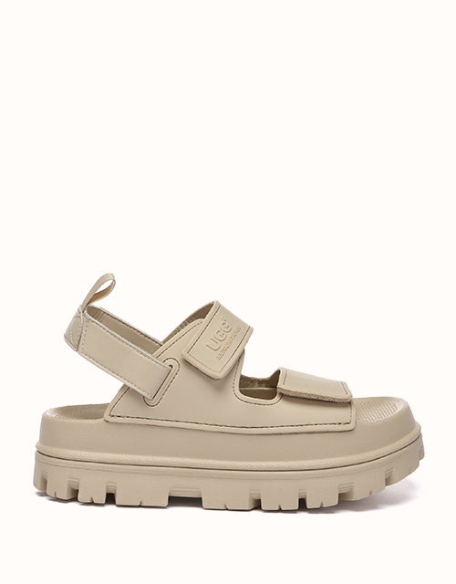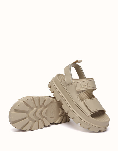 Australian Shepherd Beatia Chunky Platform Sandals combine effortless style and comfort. With double velcro straps and smooth PVC uppers, they’re easy to adjust and wear all day. Available in black, ivory, and beige.