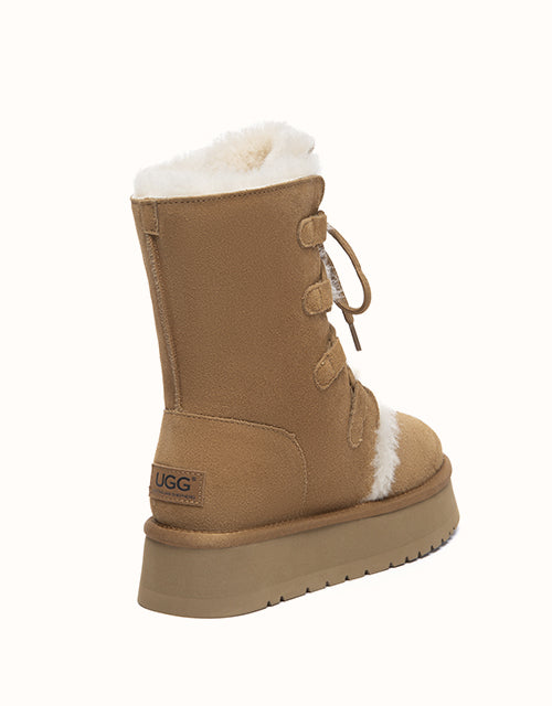 A cosy lace-up design crafted from premium cow suede and plush wool lining for natural warmth. The mid-calf height offers extra coverage, while the lightweight EVA sole ensures everyday comfort. Finished with an easy-care surface in a classic Chestnut shade that pairs effortlessly with any winter wardrobe.
