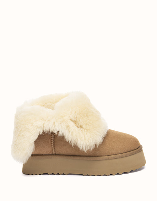Double faced sheepskin defines the Carmont Platform UGG Boots with a soft yet structured feel. Designed with a fold-down cuff, adjustable lace detail, and a subtle 3.7 cm platform, they offer gentle lift, steady comfort, and an effortlessly relaxed winter look.