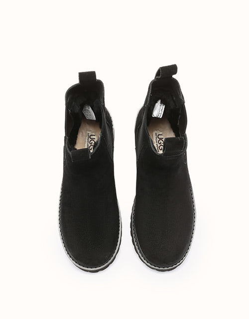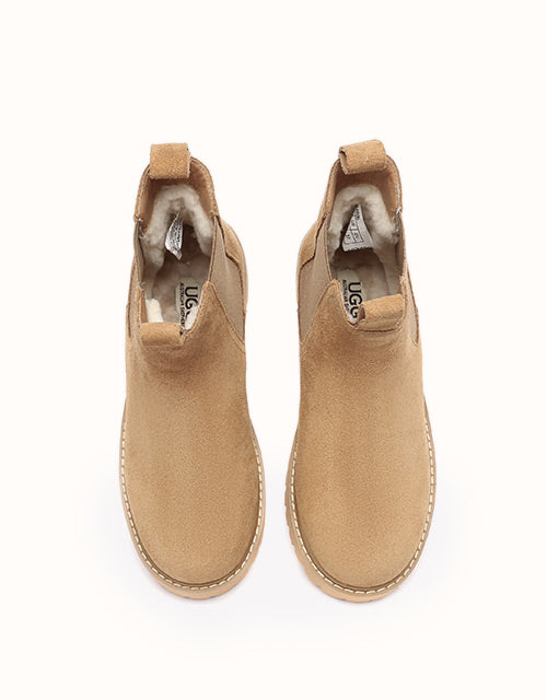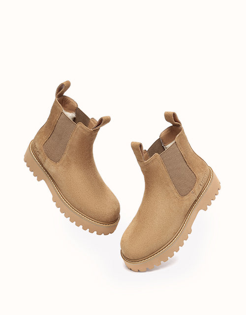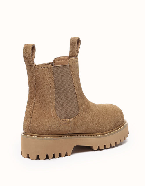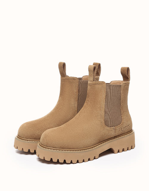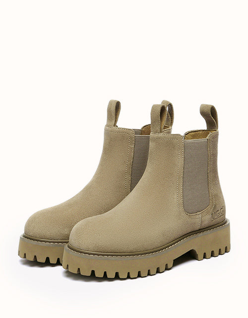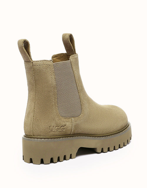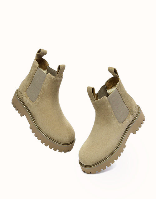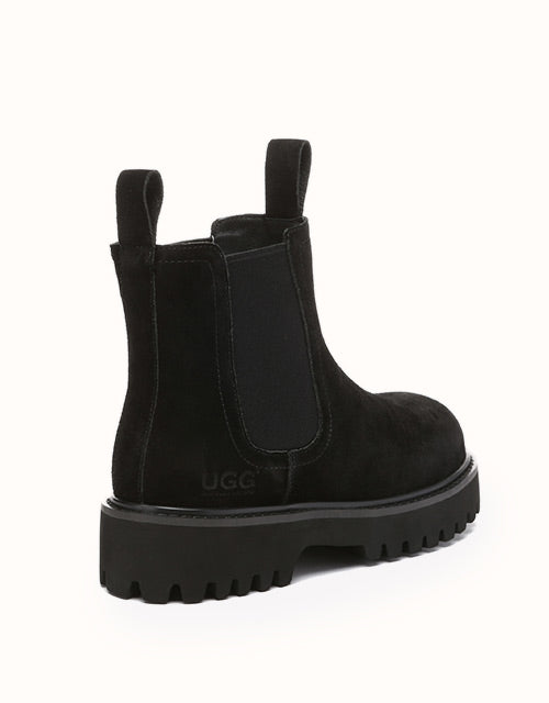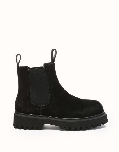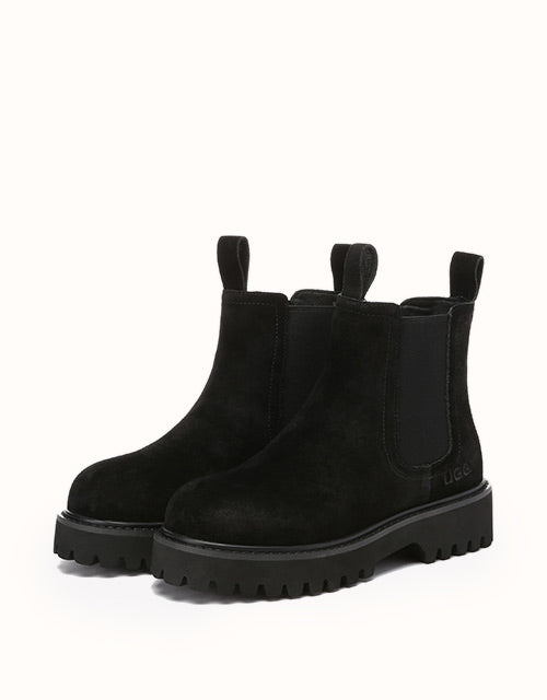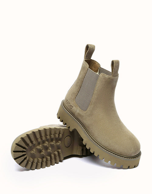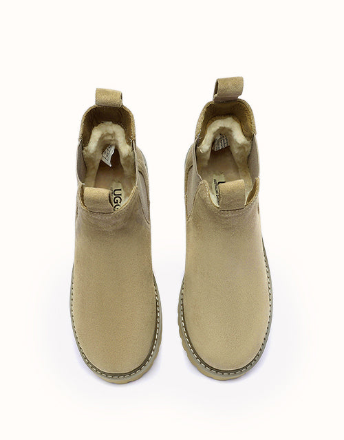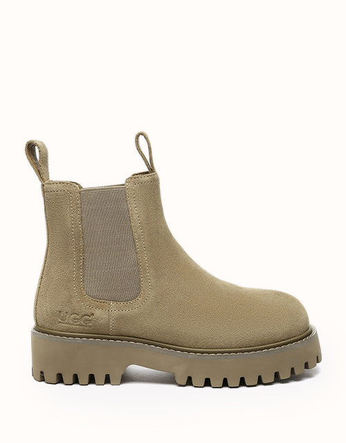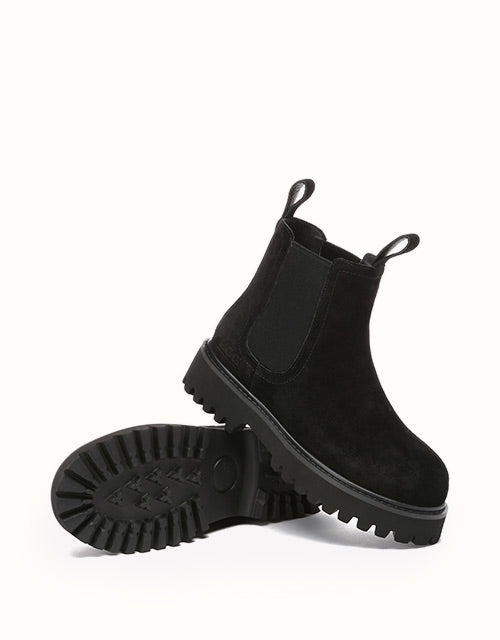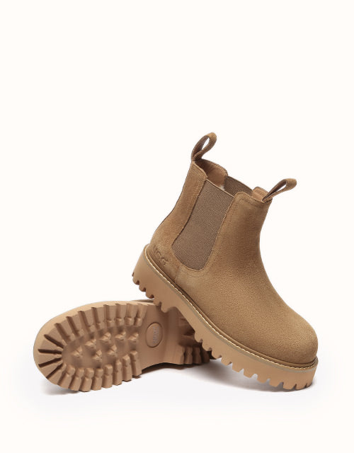 Crafted in the classic and admired Chelsea design, these Chana boots are sophisticated and minimalist, a necessary inclusion in your collection. Their snug sheepskin lining provides warmth in the colder seasons, while the durable cow suede exterior is fashioned to shield you in all weather types. With their low-maintenance characteristics, these contemporary boots exhibit adaptability, effortlessly enhancing any ensemble with grace.