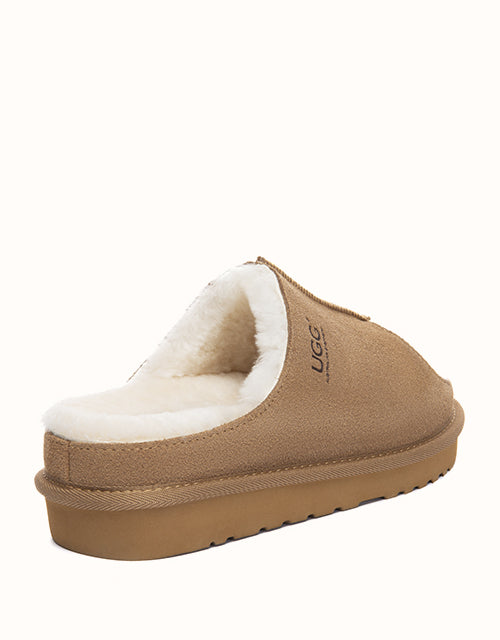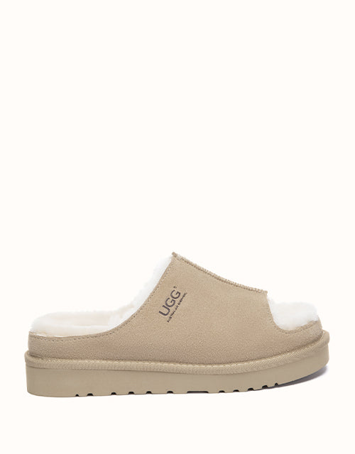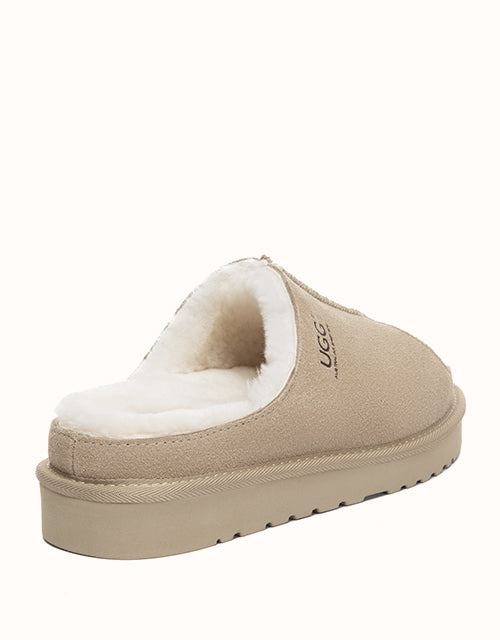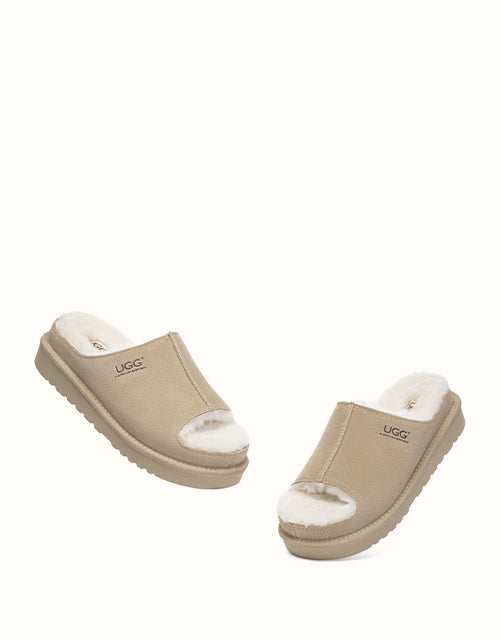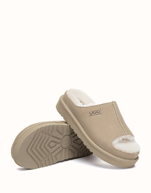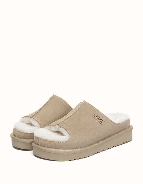 The AUSTRALIAN SHEPHERD® Colven Platform Slippers pair soft cow suede with plush sheepskin wool for warm, breathable comfort. An open-toe front adds airflow, while the cushioned platform sole offers light support for daily indoor wear. A cosy slip-on style for relaxed home living.