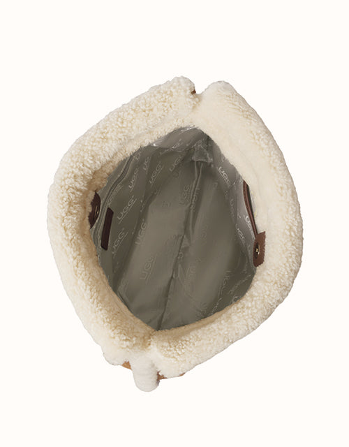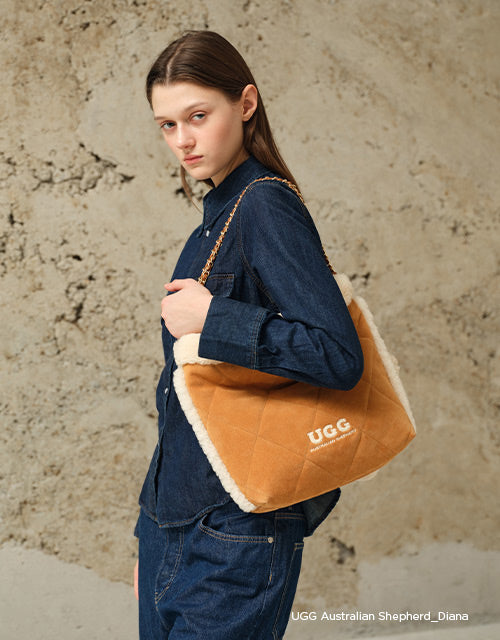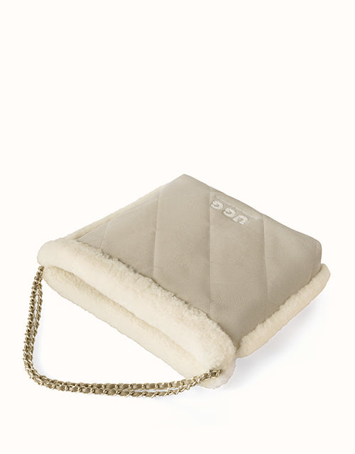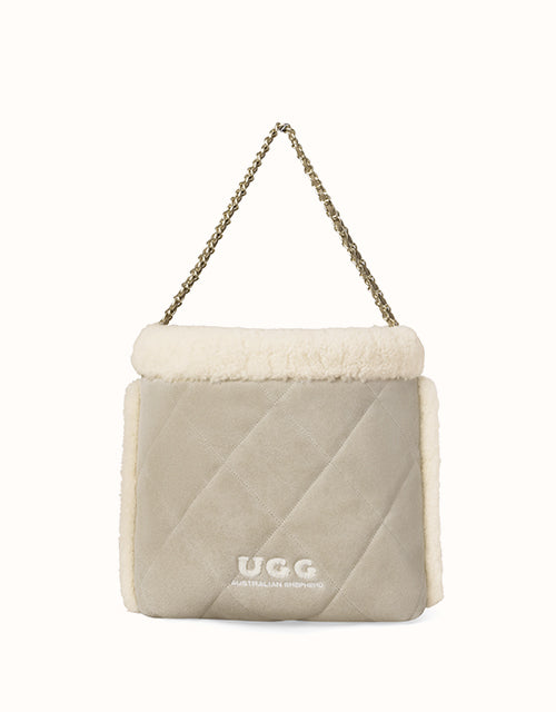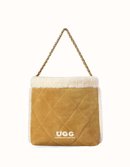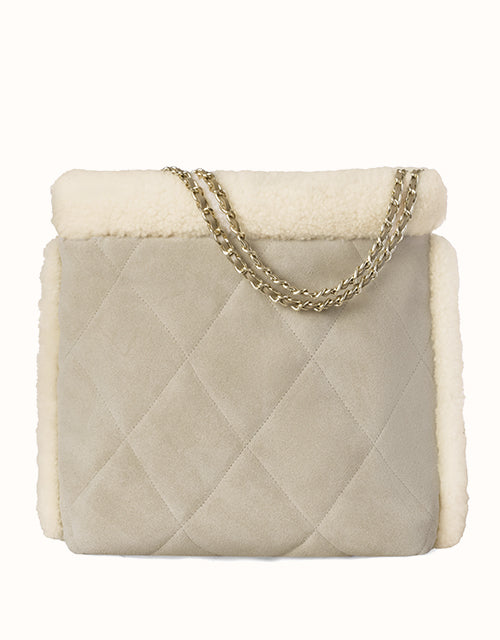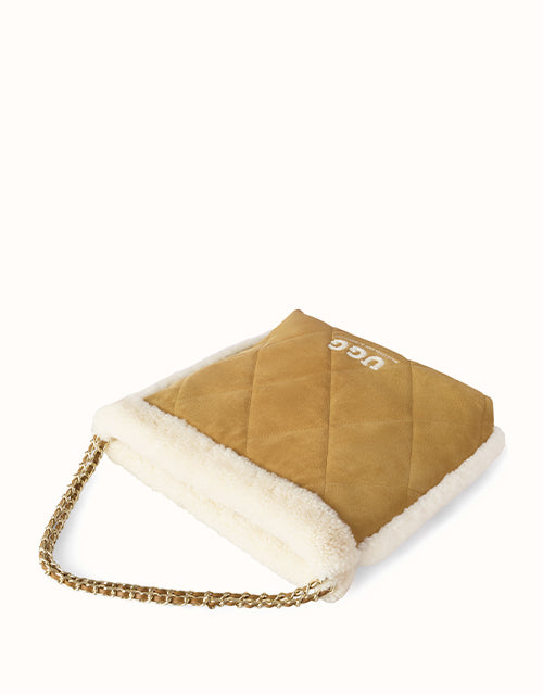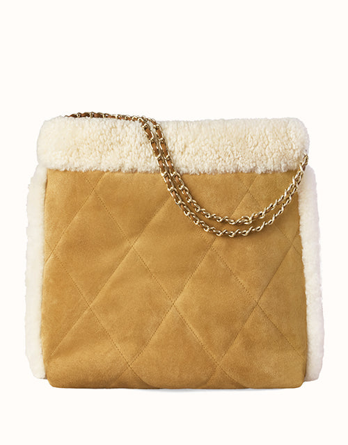 The AUSTRALIAN SHEPHERD® Suede Shearling Tote Bag Diana is crafted from cow suede with soft shearling in a quilted design. Finished with a gold-tone chain strap, this spacious tote delivers durability, warmth, and timeless elegance.