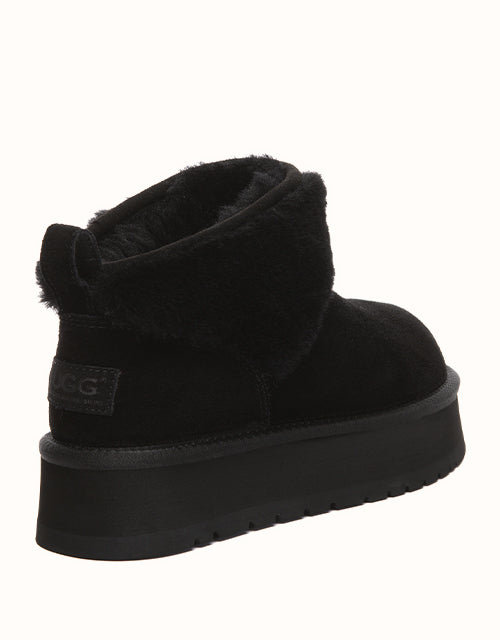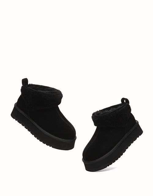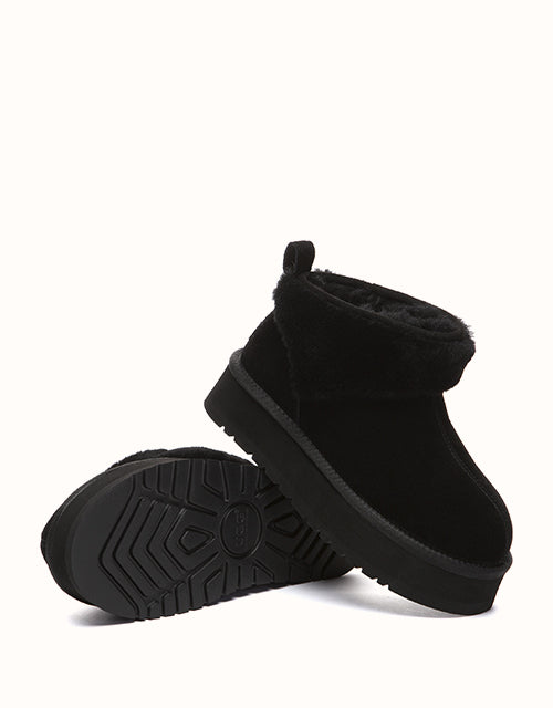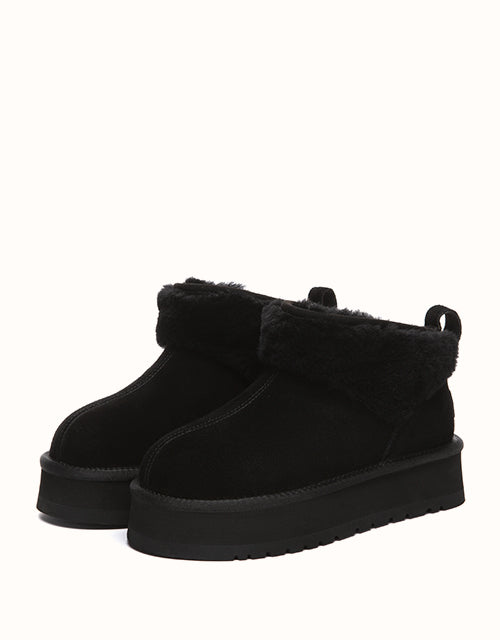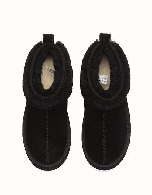 Volume, but make it soft. The Eirwen Platform reworks the classic winter ankle boot with a bold, elevated sole and an exaggerated wool collar that wraps the ankle in warmth. The silhouette feels grounded and substantial, yet the plush texture keeps it relaxed and easy. Slip it on with denim, oversized knits or long coats — it adds height, presence, and effortless comfort in one clean move. Strong in proportion, soft in feel, and built to carry you through cold days without compromise.