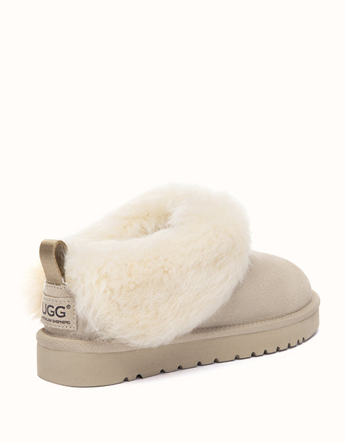 The Mianee Ankle Slippers offer cosy comfort in a soft, relaxed silhouette. Crafted from smooth cow suede and fully lined with plush sheepskin wool, they provide natural warmth with breathable comfort. The fluffy wool collar adds a gentle finishing touch, while the lightweight EVA sole ensures stable support for everyday lounging at home.