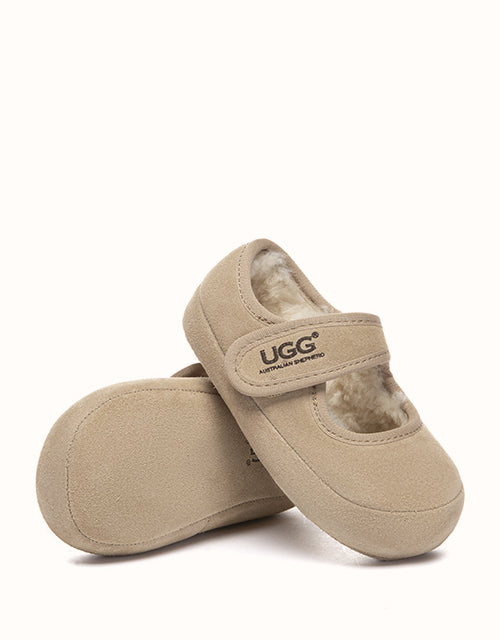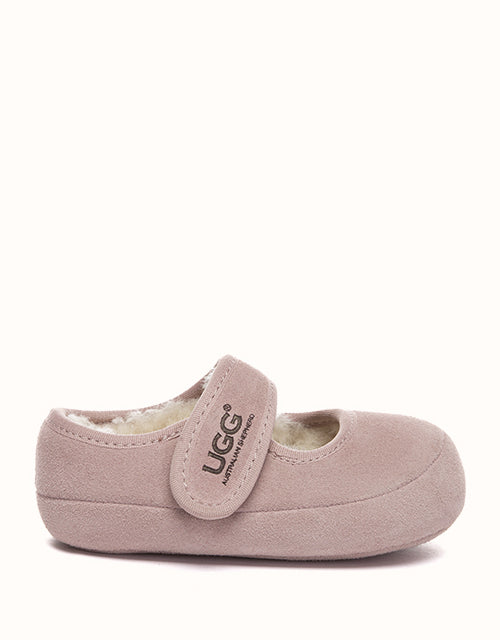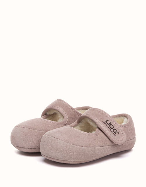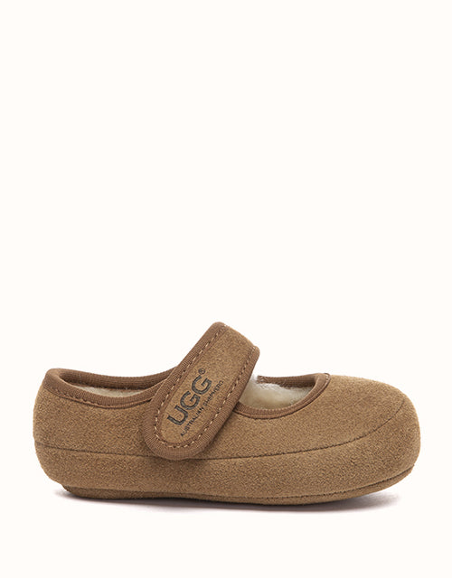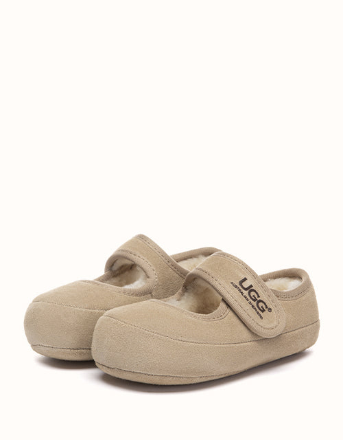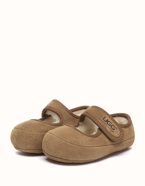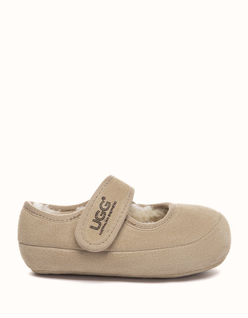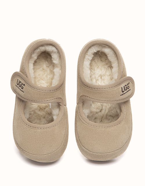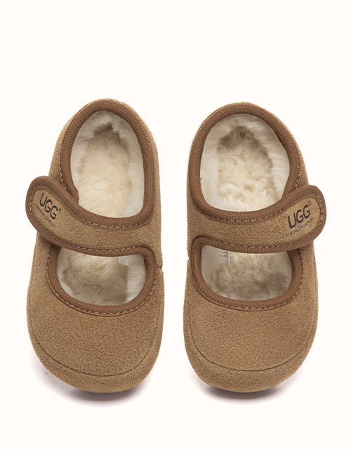 Designed for little feet, the Millie toddler slipper features a soft suede finish with a secure adjustable strap for easy wear. Lined with plush sheepskin, it offers gentle warmth and comfort—perfect for cosy indoor moments and everyday play.
