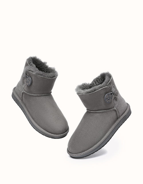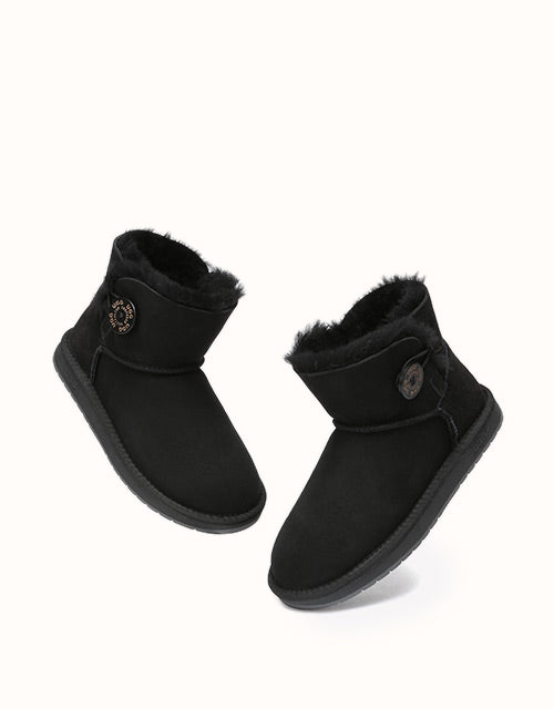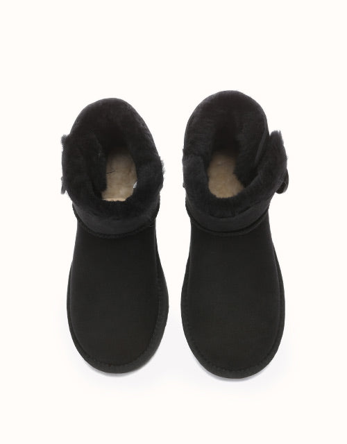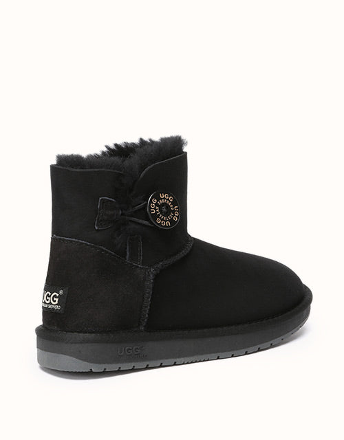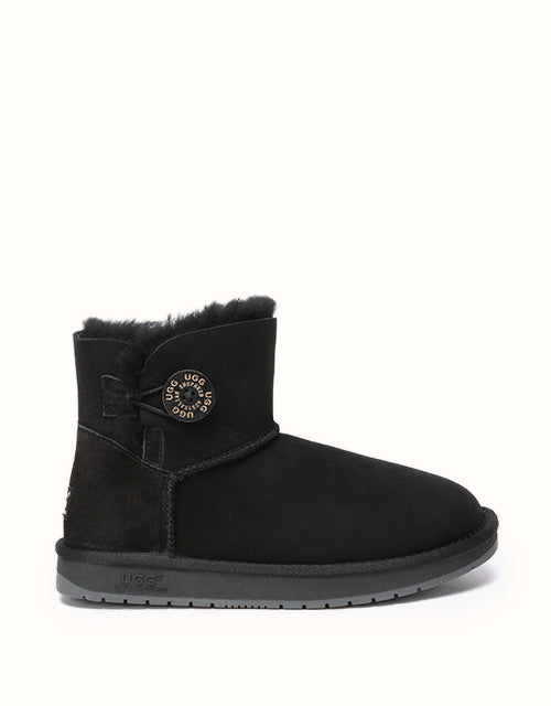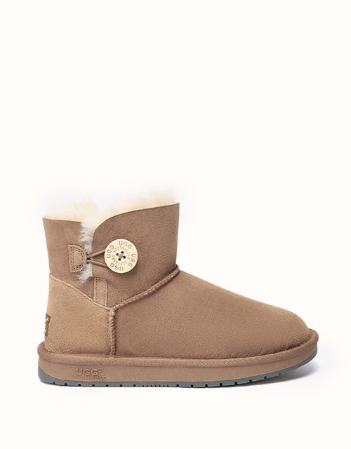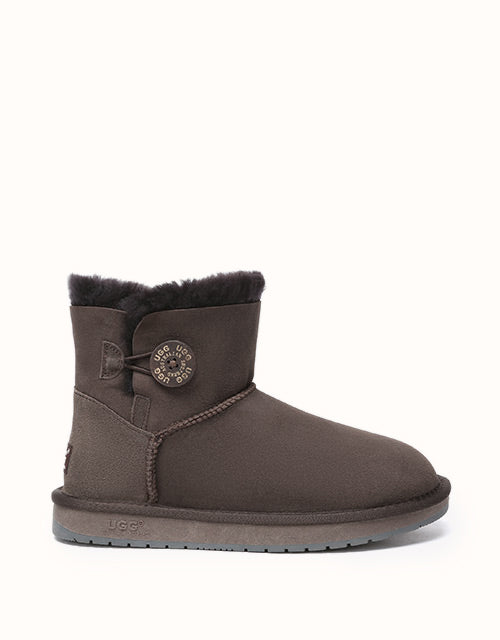 A mini wood button with logo stamp compliments exposed fur with traditional double face sheepskin which has a special molecular structure that allows the material to absorb excessive moisture, and always keep your feet warm and dry. The boots can be paired with jeans and a jacket or with a sundress during summer.