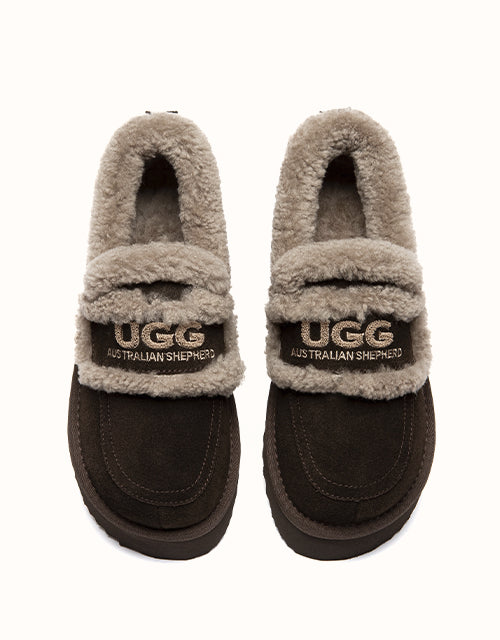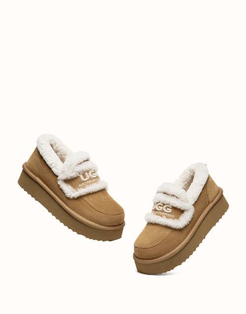 The Rilee Platform Slippers blend a soft suede finish with a cosy sheepskin lining for elevated everyday comfort. The low-cut slip-on design, plush collar, and lightweight platform sole create a warm, modern look that works indoors or outdoors. A simple, versatile winter essential.