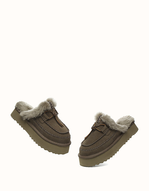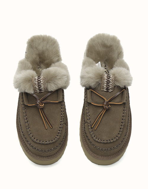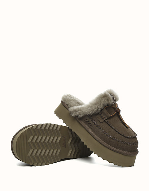 Take your next step in style with the Australian Shepherd Sammy Platform Slippers. Featuring fluffy sheepskin wool that wraps your feet in warmth and coziness during the cooler months. Available in chestnut and walnut to match your style, with a charming bow detail for an extra touch. Perfect for both indoor and outdoor wear, these slippers deliver lasting comfort and warmth — you’ll never want to take them off!