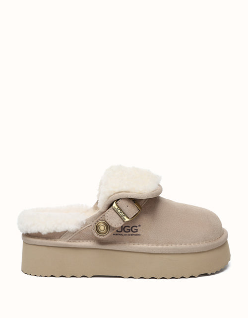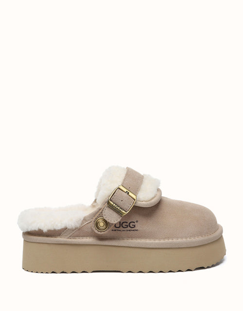 Enhance your everyday comfort with the Australian Shepherd Tenley Platform Slingback Slippers. Coming in classic chestnut and sand, these premium sheepskin slippers combine cosy warmth with timeless style. The elevated platform offers a subtle boost, while the custom EVA sole ensures soft, cushioned support. Designed with a versatile strap that can be positioned at the front or back, these slippers deliver a snug fit to complement any outfit.