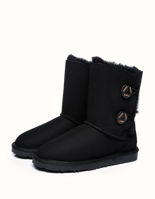 The Twin Button includes a dual button opening on the side that is both stylish and functional. The fluffy interior that spills out the top is gorgeously soft and luxurious. Put your best foot forward and step into these boots to feel like you’re walking on a big cloud.