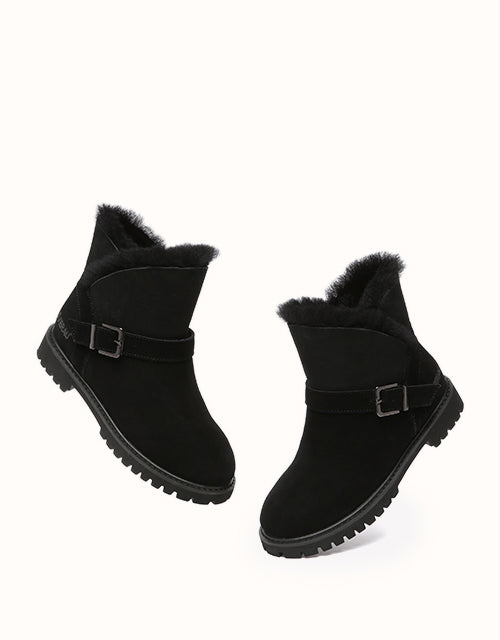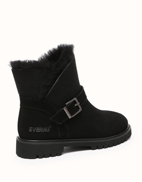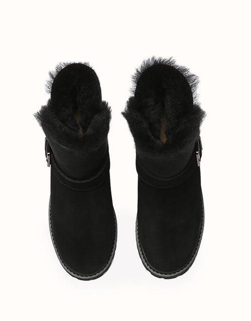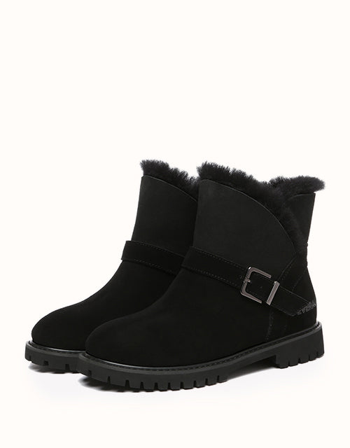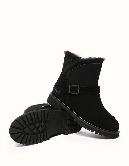 Featuring a retro buckle design with suede accents, these boots combine premium Australian sheepskin and cowhide leather for a stylish and versatile look. The V-cut boot shaft with decorative buckle straps adds a touch of rugged charm. The interior is lined with Australian Merino wool, offering moisture-wicking, breathable, and heat-retaining properties to keep feet warm and comfortable across seasons. The thick rubber outsole with groove patterns ensures excellent durability, slip resistance, and a trendy elevated look that elongates the legs while providing reliable traction.