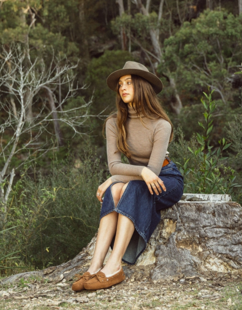 The Pommie moccasin blends timeless charm with everyday comfort. Crafted from soft cow suede and lined with plush sheepskin wool, it features a delicate bow detail for a refined finish—perfect for cosy indoor moments or relaxed outdoor wear.
