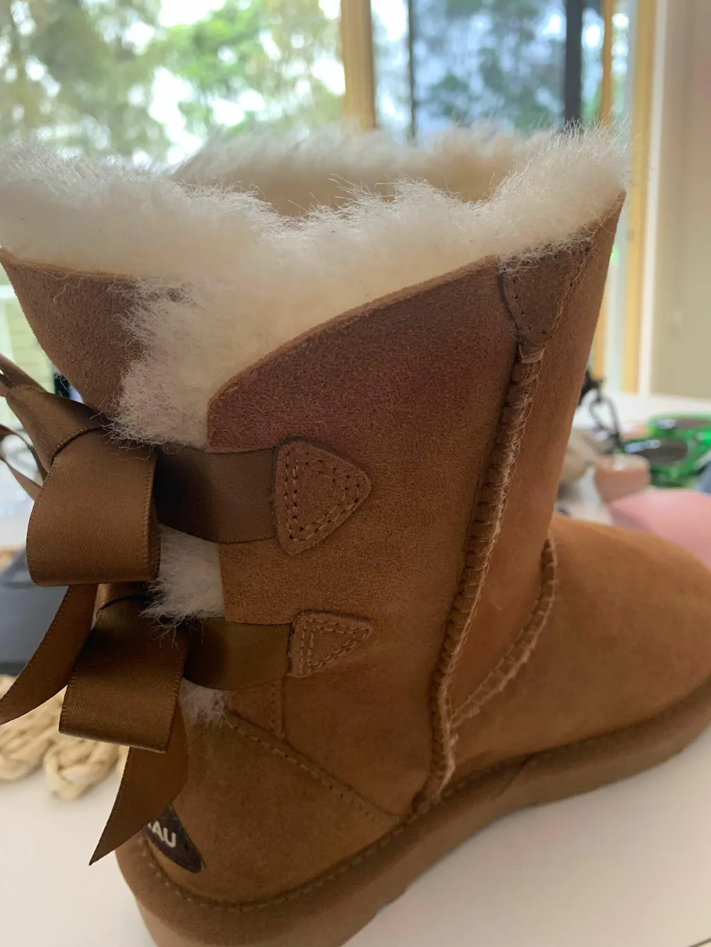 Elevate your casual wardrobe with our Short Back Bow Boots, the perfect blend of style and comfort for those crisp, chilly days. Featuring an elegant bow detail on the back, these boots add a touch of playful charm to any outfit. Available in a range of versatile shades, they’re designed to complement your favorite jeans, leggings, or cozy dresses effortlessly. Crafted with premium Sheepskin and lined with Sheepskin Wool, they ensure warmth and softness with every step. Whether you’re heading out for a coffee run or enjoying a relaxed weekend stroll, these boots are your go-to for chic and comfortable cold-weather style.