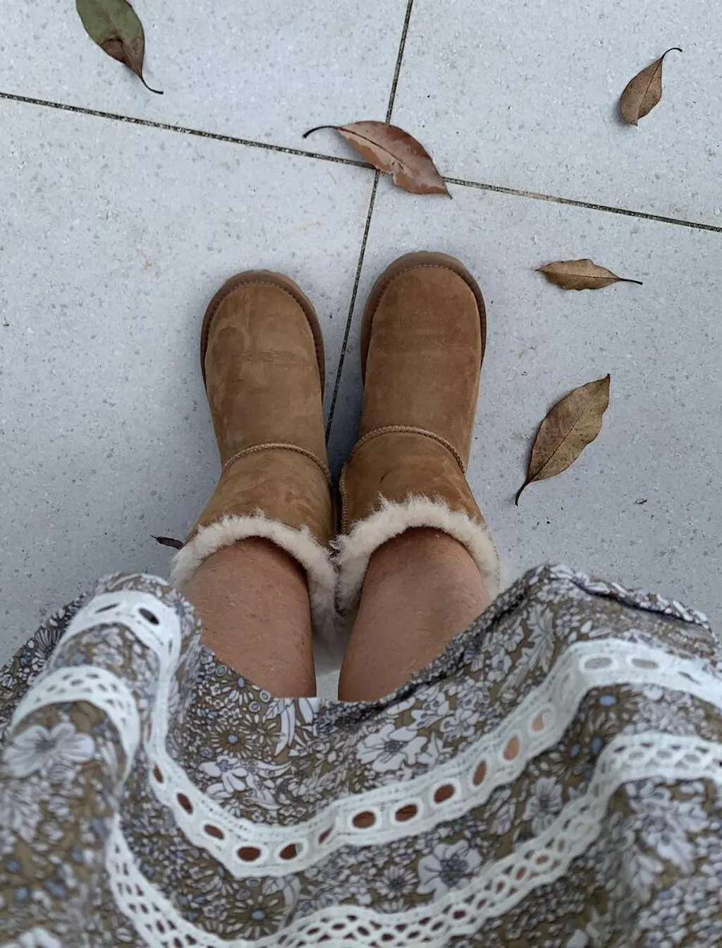 A slightly elevated look w a hint of fur at the top and 2 bows at the back … but still has classic feel and super warm. Love them!