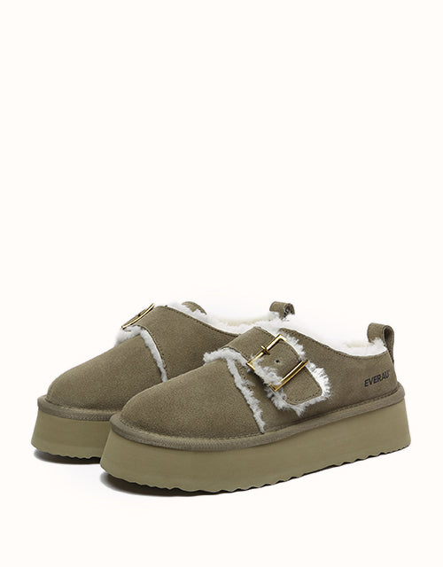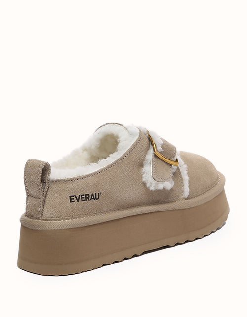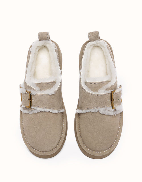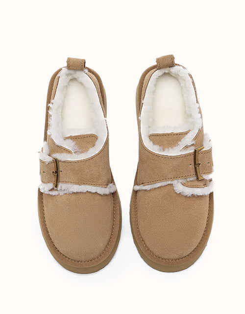 Effortlessly stylish and practical, these slip-on boots feature a shallow, slanted opening with an adjustable metal buckle and fuzzy trim, capturing the essence of autumn and winter fashion. Crafted from premium Australian Merino sheepskin, they offer breathable, moisture-wicking comfort and exceptional warmth with temperature regulation for year-round versatility. The 4cm EVA platform sole provides lightweight flexibility, memory rebound, and durability against scuffs, ensuring both elegance and functionality in every step.