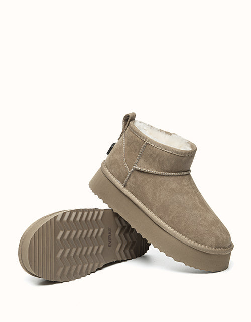 Elevate your style and comfort with the UGG EVERAU Romi Ankle Platform Boots. Designed with a trendy platform sole, these boots keep you effortlessly on-trend. Crafted from genuine sheepskin wool, they provide a plush, cloud-like warmth for ultimate coziness. Available in Chestnut, Sand, and Black, their glossy finish adds a touch of refined elegance to any look.
