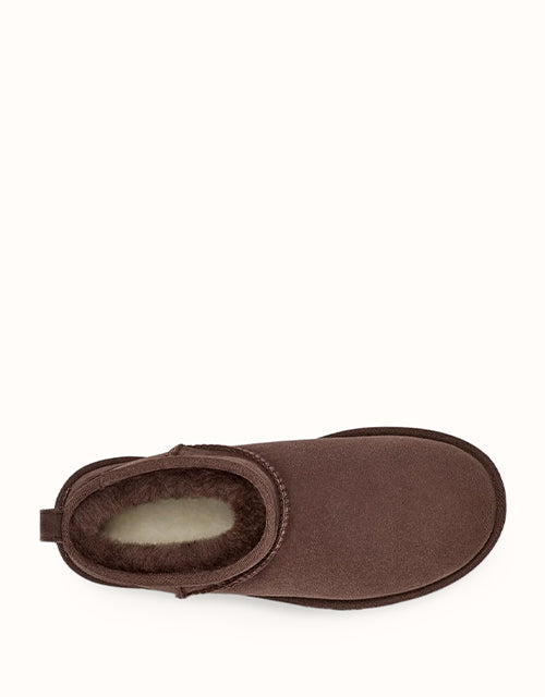 An elevated take on the icon. The UGG® Classic Ultra Mini combines timeless comfort with a modern, easy-to-wear silhouette. Featuring plush Twinface sheepskin, a lower shaft for effortless style, and a lightweight sole made with sustainable materials — reimagined for everyday luxury.