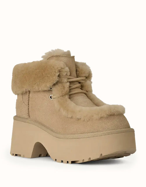 The UGG® Esmee Lace Up reimagines the Classic Boot with a modern platform silhouette. Crafted from suede with a soft sheepskin spill seam and cuffable shaft, it features plush UGGplush™ lining and a 2.75" sugarcane EVA platform outsole for lightweight comfort and elevated style.